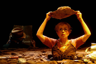 A darab elején Winnie még csak mellkasig van földben, a végén már nyakig. Beszél. A férfi ehhez képest alig szólal meg. Winnie megüli a hétköznapok kis ünnepeit. És bármi történik – vagy inkább, annak ellenére, hogy semmi sem történik – végig megőrzi derűlátását: „Ó, milyen szép is ez a mai nap, megint egy boldog, szép nap!… Mindennek ellenére!” Winnie érzi, hogy az idő fogy, de abból, ami még maradt, megpróbálja a legjobbat kihozni. A rendezés két pólusra összpontosít: az evilágira és a transzcendentálisra, miközben az állandó fenyegetettség mellett az egyetemes szeretet költészetét keresi.